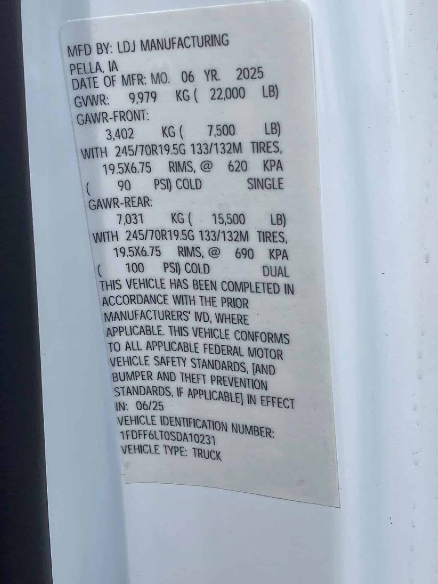 VIN: 1FDFF6LT0SDA10231